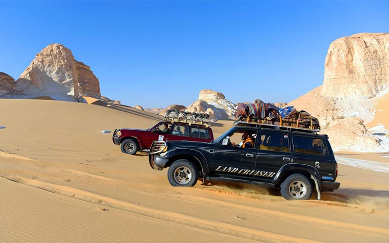 After breakfast, then move onto the White Desert, passing through the Black Desert, a region of volcano-shaped mountains with large quantities of small black stones, and the Valley of El Haize with its refreshing spring. Stop off to see the quartz crystal at Crystal Mountain and the magnificent Valley of Agabat. Camping in White Desert with a unique chance to enjoy amazing sunset view while your guides and cook your dinner.